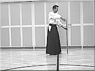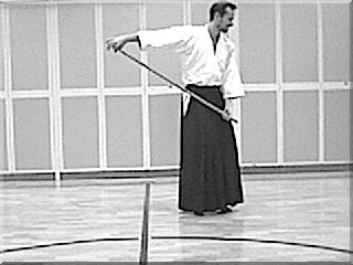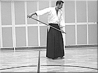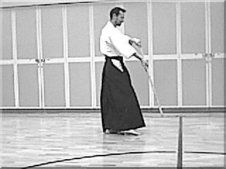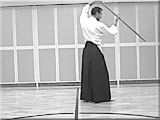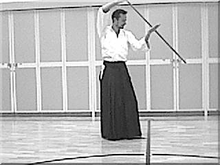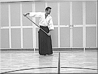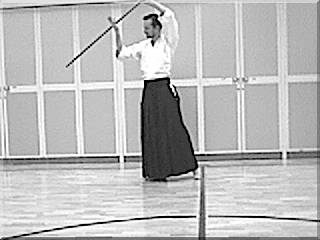 [Der Angreifer wendet sich nach rechts (hinteren linken Fuß weiter nach links umsetzen) und hält dem kommenden Schlag einfach seinen Stock entgegen. Alternativ: Konter mit gleicher Technik, „Sabaki + Gyaku Yokomen-uchi“] |