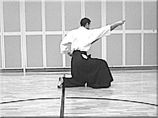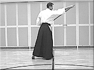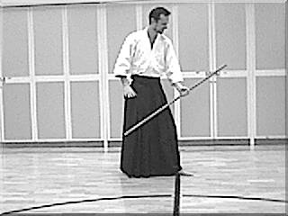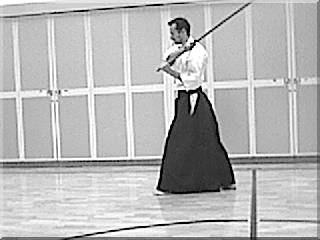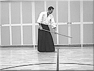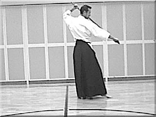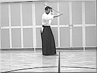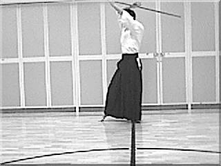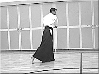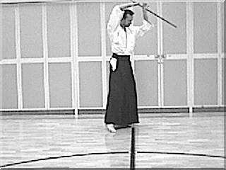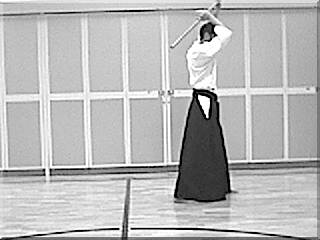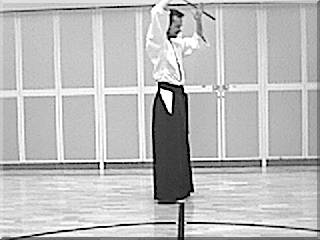 [Der Angreifer bricht „Shomen-uchi“ ab, weicht nach links aus (Wechselschritt nach links) und macht seinerseits dieselbe Technik.] |