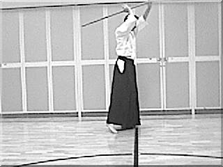 [Der Angreifer entzieht dem Feger das Ziel: setzt seinen vorderen rechten Fuß zurück und hebt gleichzeitig den Stock über Kopf.] |