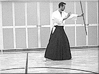[Angreifer: den Stock statt zum Stoß durch die linke/vordere Hand nun mit Schritt links zurück durch die rechte/hintere Hand gleiten lassen, und mit derselben Technik kontern.] |